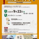 2025年8月27日 / 最終更新日 : 2025年9月22日 uehiro-admin-main 2025年度 歴史資料学研究会第40回例会(9月22日)のお知らせ 歴史資料学研究会をオンライン形式にて開催いたします。 参加ご希望の方は下記URLにアクセスいただき、所定のフォームよりお申し込み下さい。 日 時:2025年9月22日(月)18:00~20:00 会 場:オンライン(Zo […]